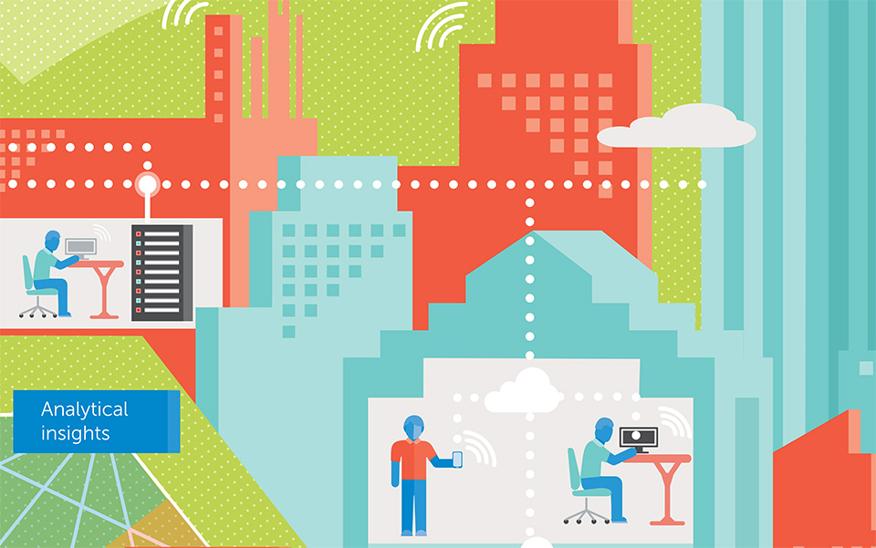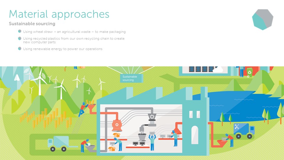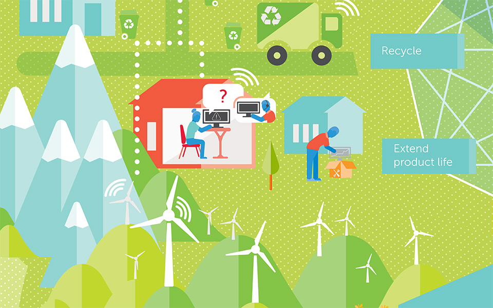The illustration builds around the main graphic with representations of the work Dell does to play a significant role in the movement towards a more sustainable future. The full version was cropped into pieces to be used in social media and presentations that could expand into more detail on each category.