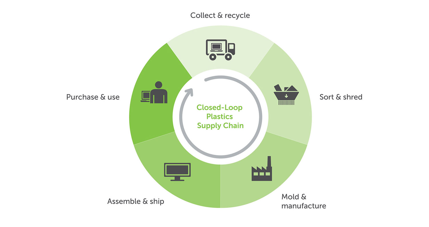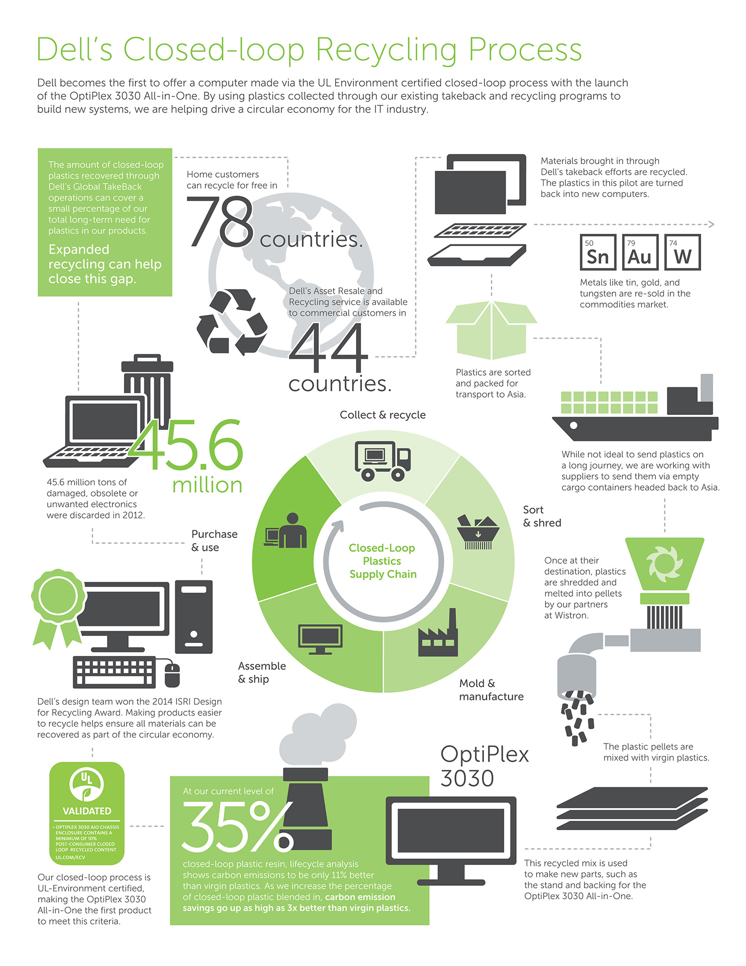 Dell is a leader in sustainability efforts in the tech industry, as evidenced by its closed loop supply chain that takes plastic from recycled computers and uses it to build new computers, thus lessening the need for new virgin plastic. To help explain the process, the team created three separate versions of the chain: 1) a simple, more iconic version that could be used to represent the chain at a high level; 2) a more complex infographic that delves into the process and its longer term effects; and 3) an animated version of the complex infographic.